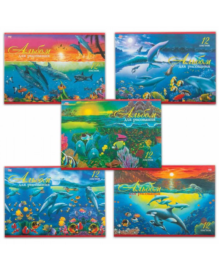 Альбом для рисования, А4, 12 листов, скоба, обложка офсет, 205х290 мм, "Дельфины", дизайны ассорти