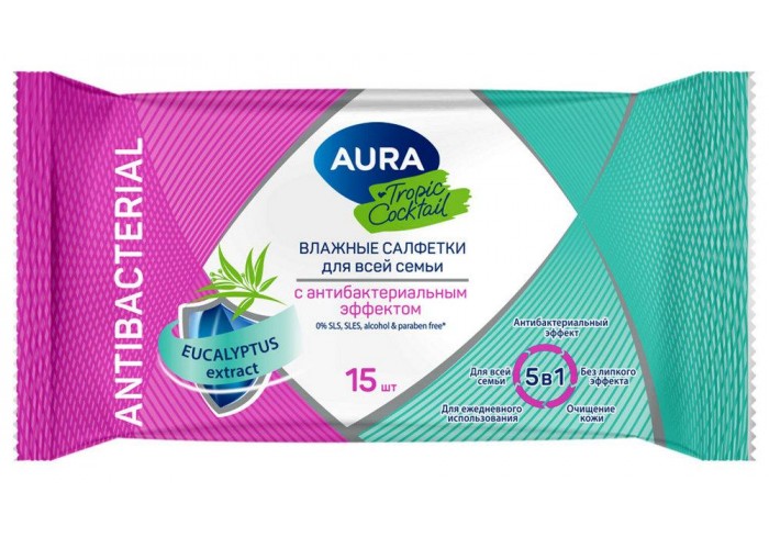 Салфетки влажные 15 шт., AURA Tropic Cocktail, c антибактериальным эффектом,
