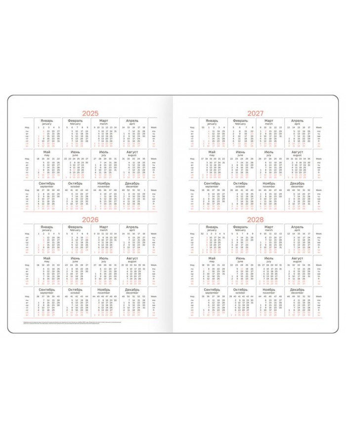 Перфорированные уголки и закладка-ляссе обеспечат комфорт и удобство при использовании ежедневника. В ежедневнике предусмотрена справочная информация, таблицы, календарь на 4 года и другие полезные сведения. Недатированный ежедневник подходит под персонализацию. Индивидуальная упаковка в термоусадочную пленку.
