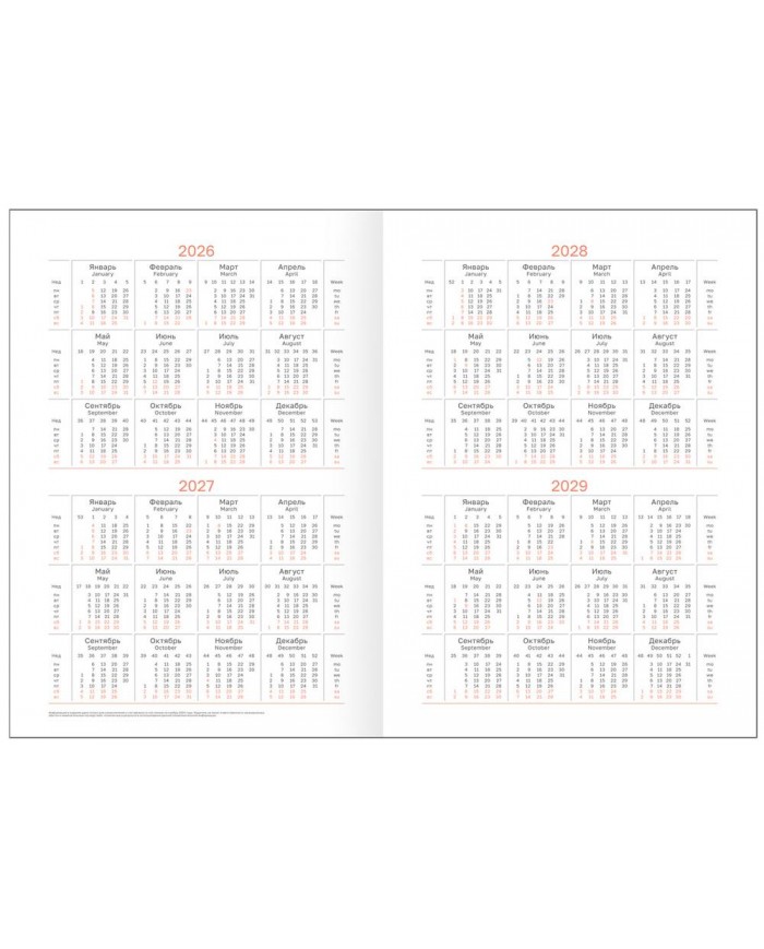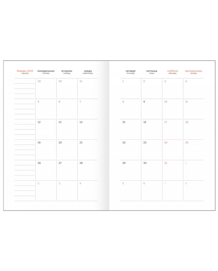 Планирование недели становится проще, когда вся информация доступна на одном развороте. Элегантная закладка обеспечивает быстрый доступ к нужной странице. Содержит календарь на 2 года, листы для записи контактов, заметок и зарисовок. Индивидуальная упаковка гарантирует его сохранность.