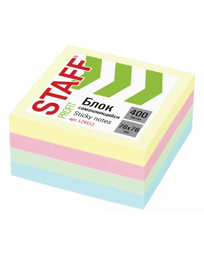 Блок самоклеящийся (стикеры) STAFF PROFIT ПАСТЕЛЬНЫЙ, 76х76 мм, 400 листов, 4 цвета