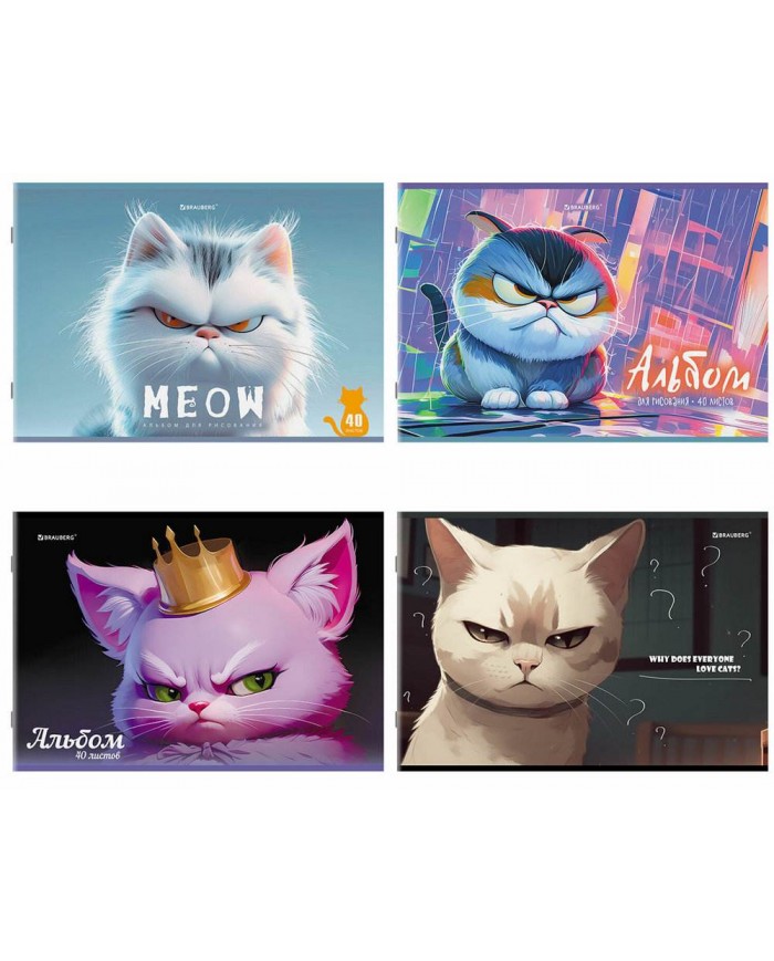 Альбом для рисования А4, 40 листов, скоба, обложка картон, 203х288 мм, "Суровые коты" 4 вида