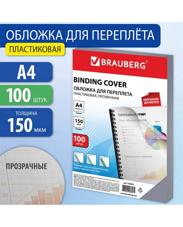 Обложки пластиковые для переплета, А4, КОМПЛЕКТ 100 шт., 150 мкм, прозрачные, BRAUBERG