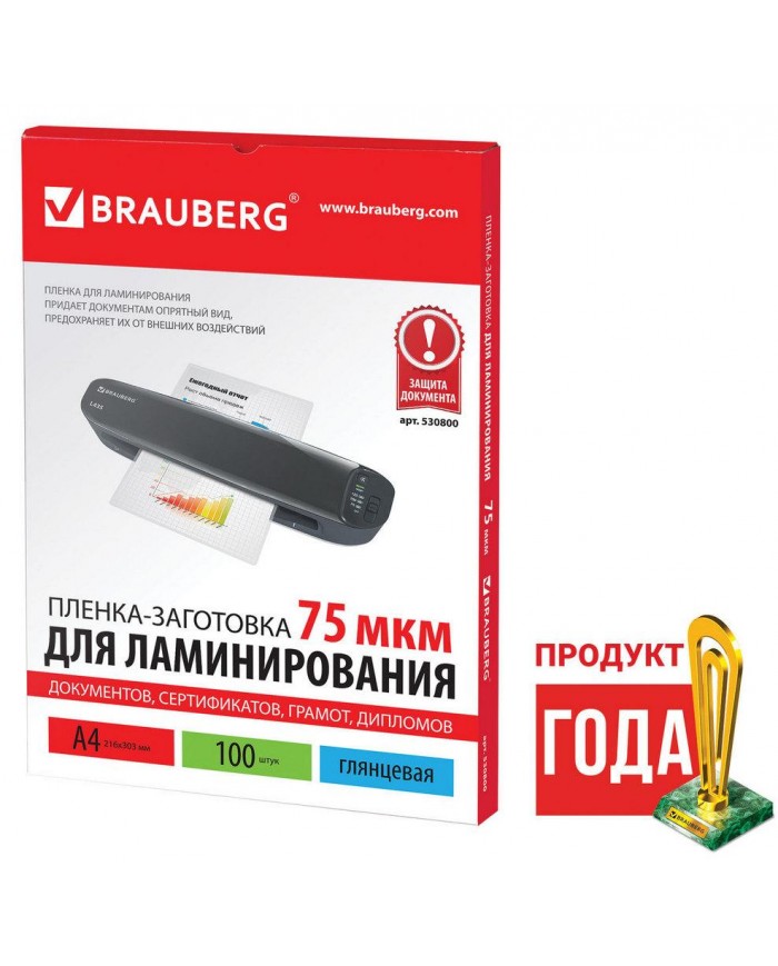 Пленка для ламинирования А4, КОМПЛЕКТ 100 шт., 75 мкм, BRAUBERG