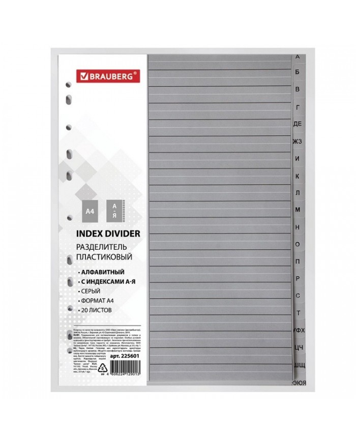 Разделитель пластиковый BRAUBERG, А4, 20 листов, алфавитный А-Я, оглавление, серый