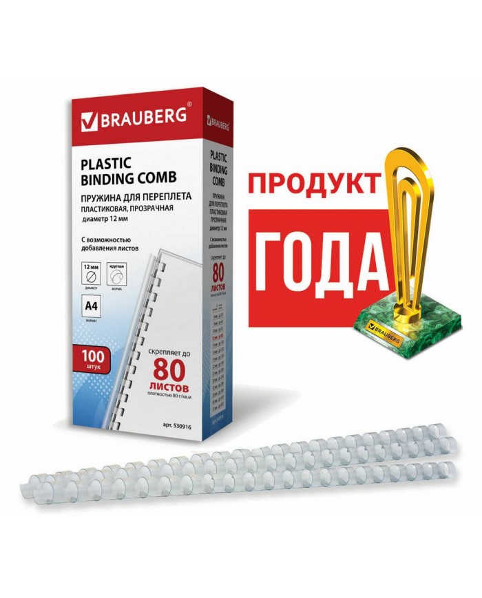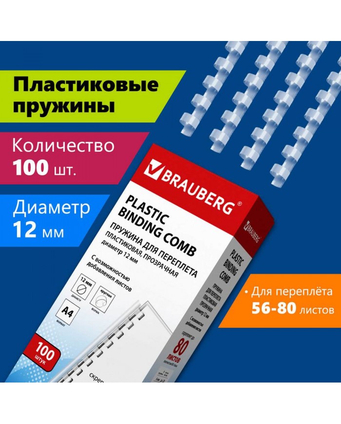 Пружины пластиковые для переплета, КОМПЛЕКТ 100 шт., 12 мм (для сшивания 56-80 л.), прозрачные, BRAU