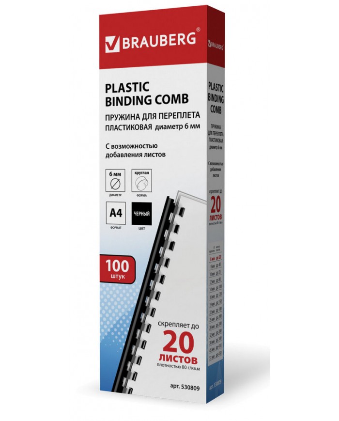 Пружины пластиковые для переплета, КОМПЛЕКТ 100 шт., 6 мм (для сшивания 10-20 л.), черные, BRAUBERG,