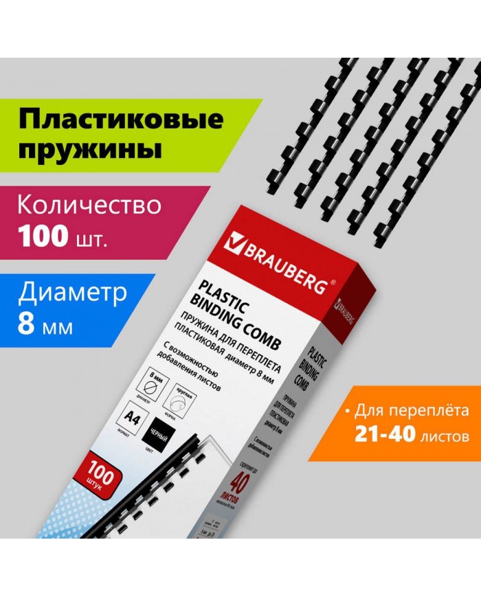 Пружины пластиковые для переплета, КОМПЛЕКТ 100 шт., 8 мм (для сшивания 21-40 л.), черные, BRAUBERG