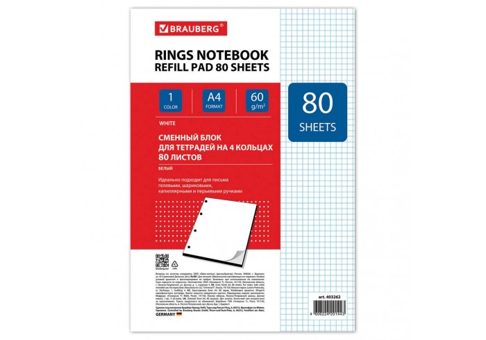 Подходит для всех тетрадей на кольцах формата А4. Внутренний блок содержит 80 листов белой, офсетной бумаги плотностью 60 г/м2. Линовка - в клетку без..