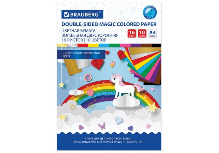 Набор офсетной двусторонней цветной бумаги плотностью 65 г/м2 включает 16 листов формата А4 (200х275 мм) в 8-ми разнообразных и насыщенных однородных ..