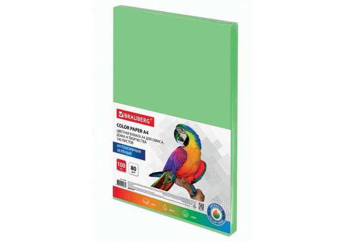 Упакована в пачки по 100 листов формата А4. В упаковке бумага интенсивного тона зеленого цвета. Листы бумаги плотностью 80 г/м2 подходят для офисной т..