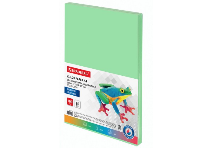 Упакована в пачки по 100 листов формата А4. В упаковке бумага умеренно-насыщенного тона зеленого цвета. Листы бумаги плотностью 80 г/м2 подходят для о..