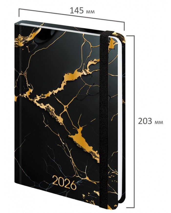 Ежедневник датированный 2026 с резинкой 145х203 мм, А5, BRAUBERG, твердый, фольга, "Черный мрамор",