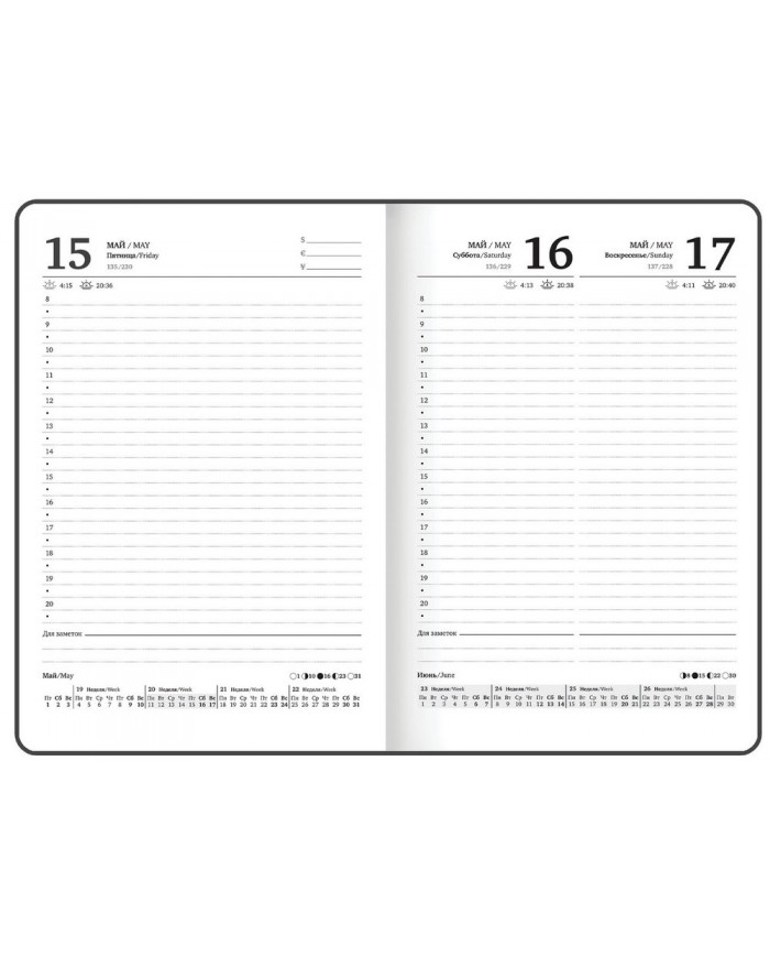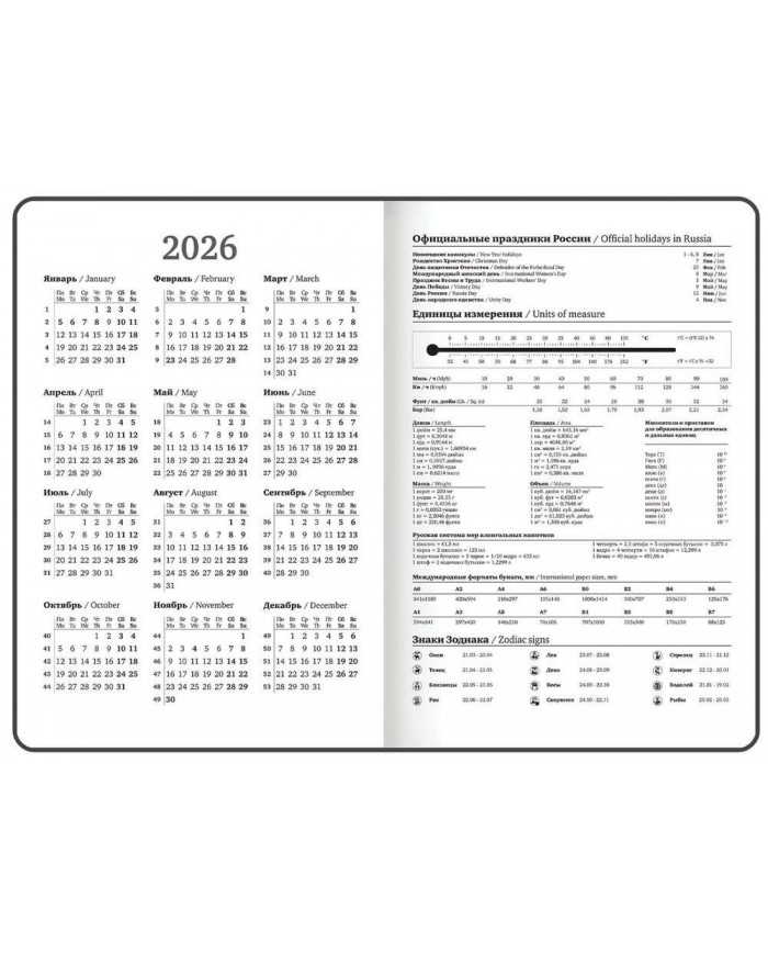 Внутренний блок состоит из 160 листов офсетной бумаги плотностью 60 г/м2. Обложка 7БЦ (твердый переплет с матовой пленкой) обеспечивает долговечность при активном использовании. Благодаря стандартному формату А5 (145х203 мм) датированный ежедневник удобно использовать как в офисе, так и на выездных деловых встречах. Резинка-фиксатор надежно защищает от случайного раскрытия в сумке или портфеле. Печать внутреннего блока – в одну краску. Ежедневник снабжен справочным материалом.