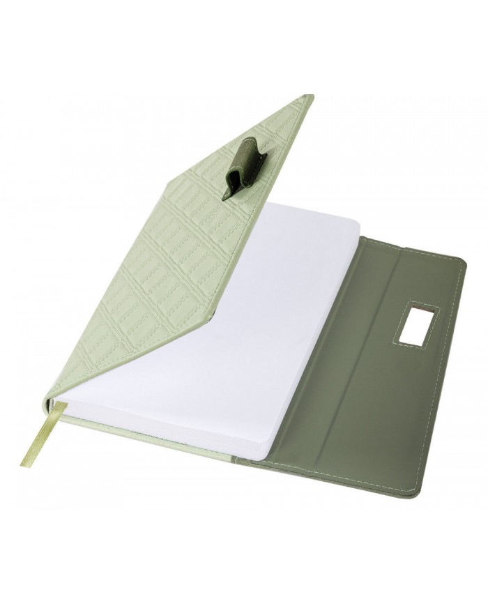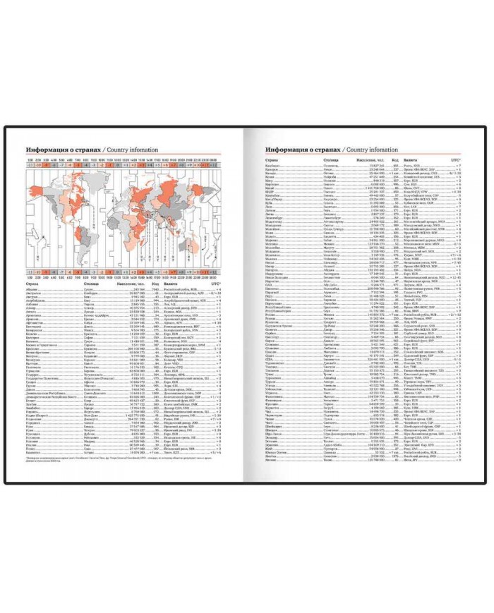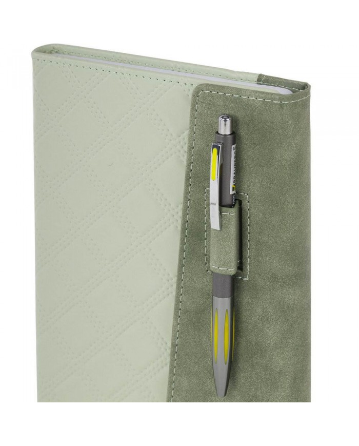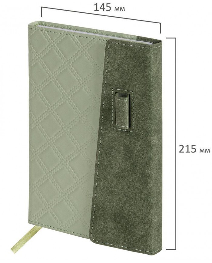 Внутренний блок включает 160 листов белой бумаги плотностью 70 г/м2. Каждая страница имеет перфорированный угол. Благодаря стандартному формату А5 (145х215 мм) ежедневник удобно использовать как в офисе, так и на выездных деловых встречах. Твёрдая обложка стилизована под кожу со стёганым рисунком и подходит для горячего тиснения. Ежедневник снабжён держателем для ручки и магнитной застёжкой, благодаря чему не откроется в сумке или портфеле. Уголки ежедневника закруглены. Дополнением служит закладка-ляссе, с помощью которой можно быстро открыть нужную страницу. Ежедневник снабжён обширным справочным материалом. В конце предусмотрены 7 страниц для записей и заметок.