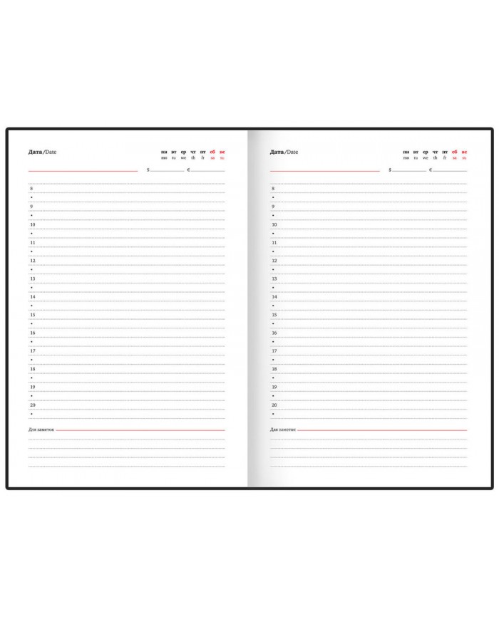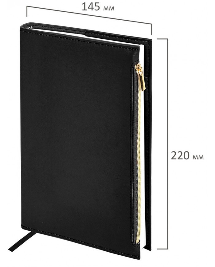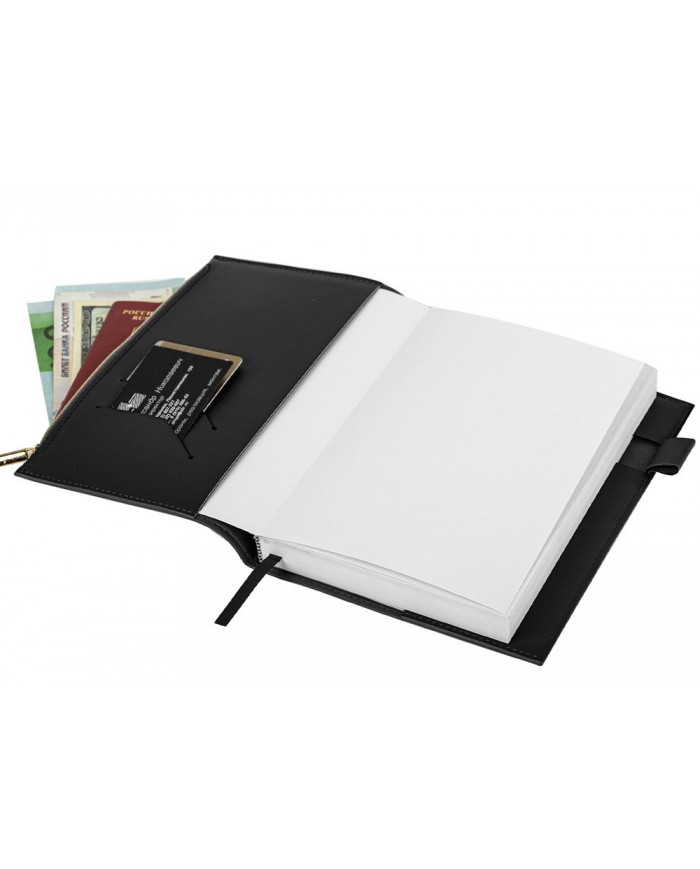 Внутренний блок включает 160 листов белой бумаги плотностью 70 г/м2. Каждая страница имеет перфорированный угол. Благодаря стандартному формату А5 (145х220 мм) ежедневник удобно использовать как в офисе, так и на выездных деловых встречах. Съёмная гибкая обложка стилизована под гладкую кожу и подходит для горячего тиснения. Особенностью этого ежедневника являются большой карман на молнии и небольшие кармашки для визитных карточек на внутренней стороне обложки. Дополнением служат закладка-ляссе, с помощью которой можно быстро открыть нужную страницу, а также держатель для ручки для большего комфорта. Ежедневник снабжён обширным справочным материалом. В конце есть 7 страниц для записей и заметок.