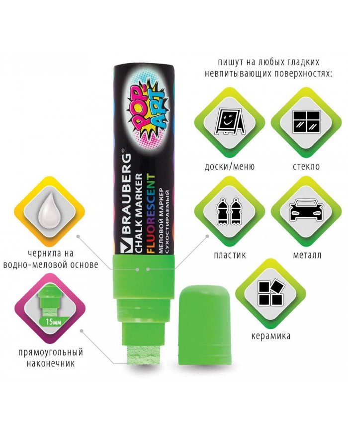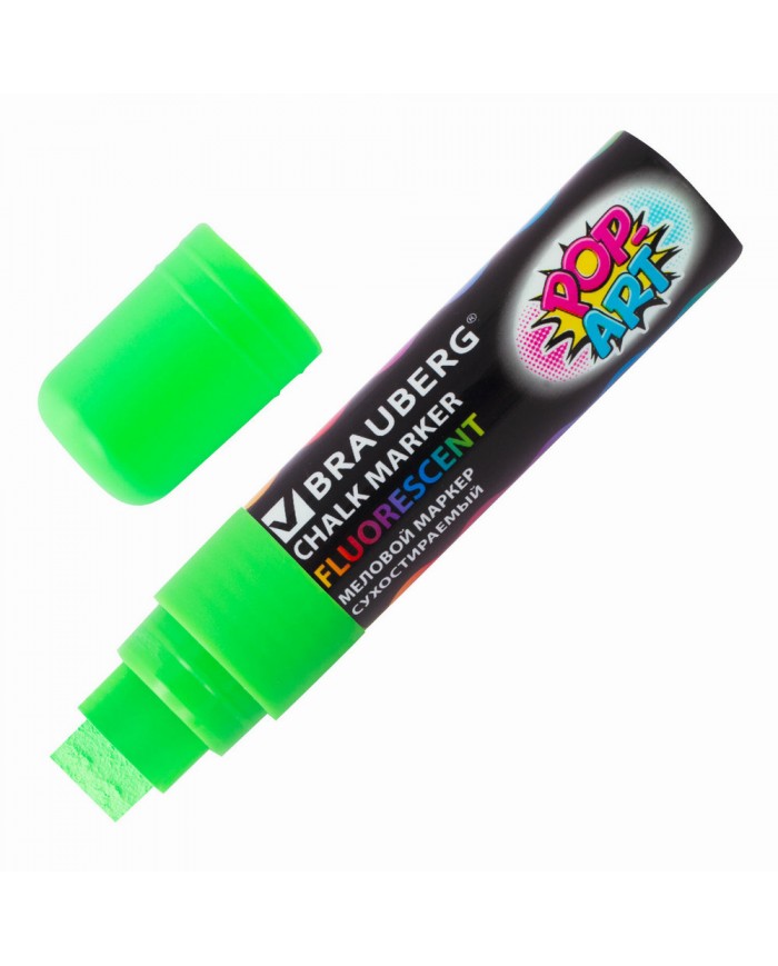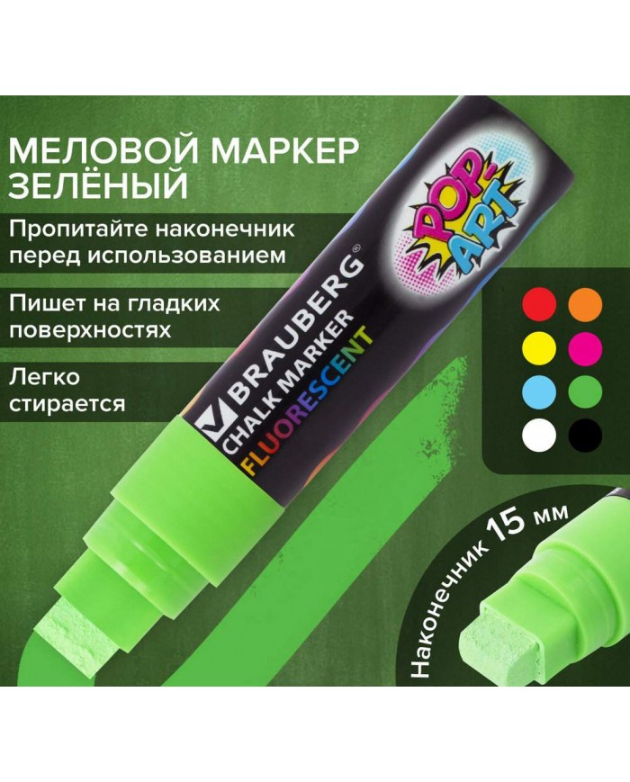 Маркер меловой "POP-ART" ЗЕЛЕНЫЙ, 15 мм, стираемый, для гладких поверхностей, BRAUBERG,