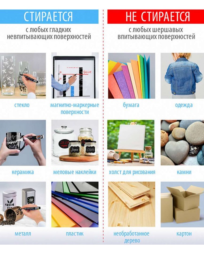 СПОСОБ ПРИМЕНЕНИЯ: 1. Перед использованием хорошо встряхнуть с закрытым колпачком. 2. Снять колпачок, надавить на наконечник, дождаться, когда чернила полностью пропитают его. 3. После использования плотно закрыть колпачок. Предназначен для росписи, создания рисунков и надписей на зеркалах, стекле, меловой пленке и прочих гладких и прозрачных невпитывающих поверхностях. Рисунок получается плотный и яркий. Чернила на водно-меловой основе красного цвета без резкого запаха. Толщина линии письма - от 2 мм до 15 мм, зависит от угла наклона мелового маркера. Круглый корпус выполнен из пластика. Обладает следующими преимуществами: - чернила светятся в УФ-свете; - повышенная светостойкость; - прямоугольный наконечник устойчив к повреждению и истиранию.