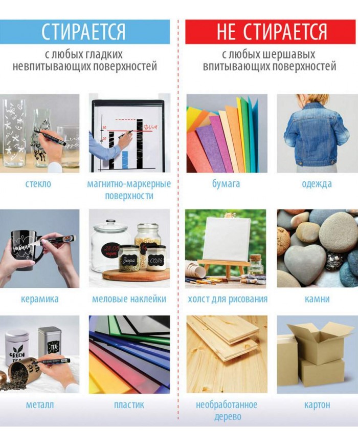 СПОСОБ ПРИМЕНЕНИЯ: 1. Перед использованием хорошо встряхнуть с закрытым колпачком. 2. Снять колпачок, надавить на наконечник, дождаться, когда чернила полностью пропитают его. 3. После использования плотно закрыть колпачок. Предназначен для росписи, создания рисунков и надписей на зеркалах, стекле, меловой пленке и прочих гладких и прозрачных невпитывающих поверхностях. Рисунок получается плотный и яркий. Чернила на водно-меловой основе черного цвета без резкого запаха. Толщина линии письма - от 2 мм до 15 мм, зависит от угла наклона мелового маркера. Круглый корпус выполнен из пластика. Обладает следующими преимуществами: - чернила светятся в УФ-свете; - повышенная светостойкость; - прямоугольный наконечник устойчив к повреждению и истиранию. Данный товар - это сочетание высокого качества по приемлемой цене.