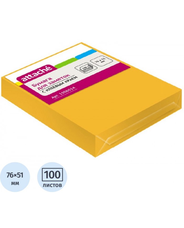 Стикеры Attache в формате 76x51 мм, оранжевого цвета, 100 листов. Хорошо подойдут для сотрудников творческих профессий и руководителей: рекомендуются для использования в процессе совещаний, обучения, мозговых штурмов. Тон стикеров - неоновый. Плотность бумаги: 70-72 г/кв.м. клейкий слой - 15 Н/м. Длина клейкой стороны 51 мм. После удаления бумаги на поверхности не остается следов клеевого состава, лист можно крепить повторно. Особых условий хранения не требует, сертификации не подлежит, срок годности не ограничен.Чтобы увеличить срок службы стикеров, пожалуйста, следуйте рекомендациям:1) Отделять стикер от блока следует вдоль клеевой полосы. Так можно избежать скручивания и последующего отклеивания стикера.2) Прежде чем наклеивать стикер, убедитесь в отсутствии грязи и пыли на поверхности. На чистой поверхности срок службы клеевого слоя более продолжителен.Законодательные и технические документы: