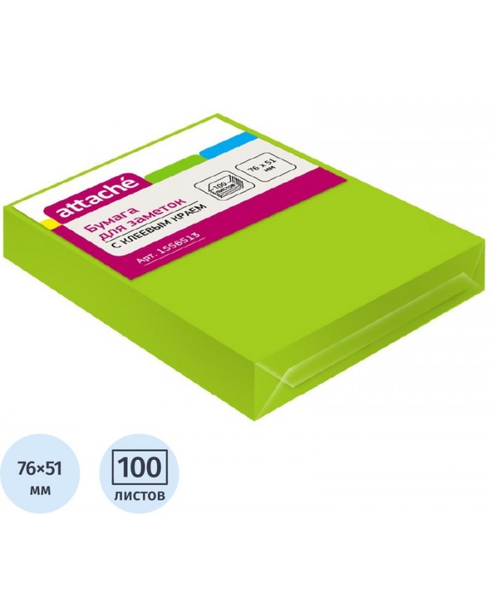 Стикеры Attache в формате 76x51 мм, зеленого цвета, 100 листов.Хорошо подойдут для сотрудников творческих профессий и руководителей: рекомендуются для использования в процессе совещаний, обучения, мозговых штурмов. Тон стикеров - неоновый. Плотность бумаги: 70-72 г/кв.м. клейкий слой - 15 Н/м. Длина клейкой стороны 51 мм. После удаления бумаги на поверхности не остается следов клеевого состава, лист можно крепить повторно. Особых условий хранения не требует, сертификации не подлежит, срок годности не ограничен.Чтобы увеличить срок службы стикеров, пожалуйста, следуйте рекомендациям:1) Отделять стикер от блока следует вдоль клеевой полосы. Так можно избежать скручивания и последующего отклеивания стикера.2) Прежде чем наклеивать стикер, убедитесь в отсутствии грязи и пыли на поверхности. На чистой поверхности срок службы клеевого слоя более продолжителен.Законодательные и технические документы: