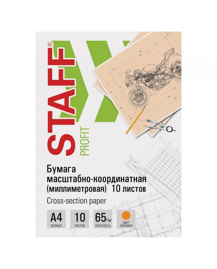 Бумага формата А4 (210х297 мм) и плотностью 65 г/м2. Упакована в картонную папку по 10 листов. Цвет линовки - оранжевый. Отличается четкими линиями и точной миллиметровой разметкой.