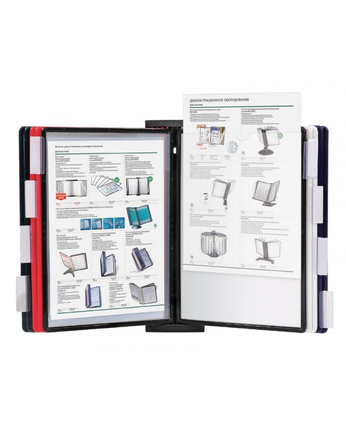 10 двухсторонних цветных панелей позволяют разместить одновременно до 20 листов формата А4. Прочные и гибкие литые рамки панелей изготовлены из полипропилена, пригодного для повторной переработки и дальнейшего использования. Демопанели оснащены съемными ярлычками-табуляторами для маркировки и удобного поиска нужной информации. Карман демопанели из прочного прозрачного материала с антибликовым покрытием надежно защитит документы от внешних воздействий. Винты для крепления демосистемы к стене пост