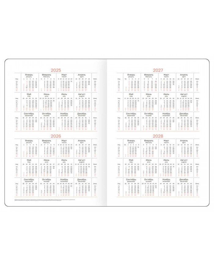 Перфорированные уголки и закладка-ляссе обеспечат комфорт и удобство при использовании ежедневника. В ежедневнике предусмотрена справочная информация, таблицы, календарь на 4 года и другие полезные сведения. Недатированный ежедневник подходит под персонализацию. Индивидуальная упаковка в термоусадочную пленку.