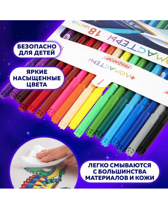 Количество цветов-18 Тип чернил-смываемые Основа-водная Ширина линии письма-1.0 мм Наконечник-фибровый, пулевидный Длина корпуса-136 мм Диаметр корпус..