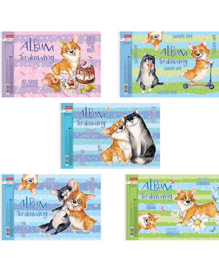 Альбом для рисования А4 24 л., спираль, обложка картон, HATBER, 205х290 мм, "Корги" ,5 видов