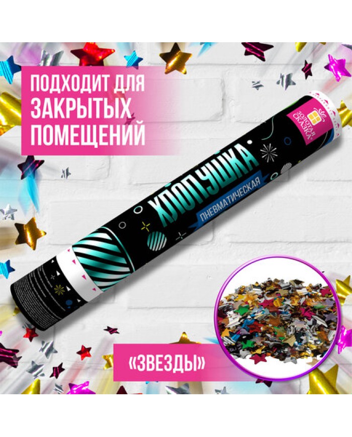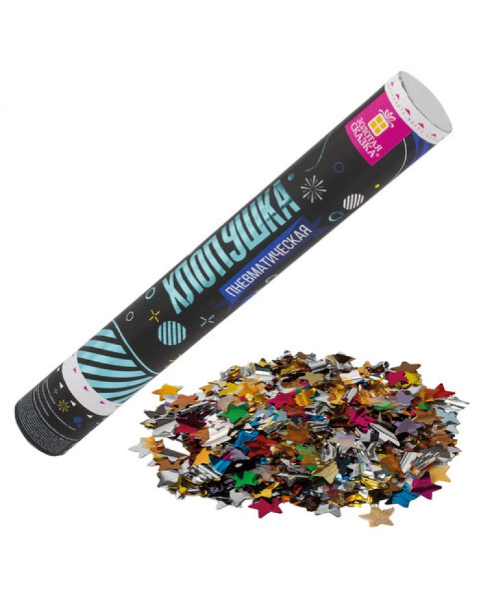 Хлопушка пневматическая ЗОЛОТАЯ СКАЗКА 40 см, фольга, звезды, ассорти,