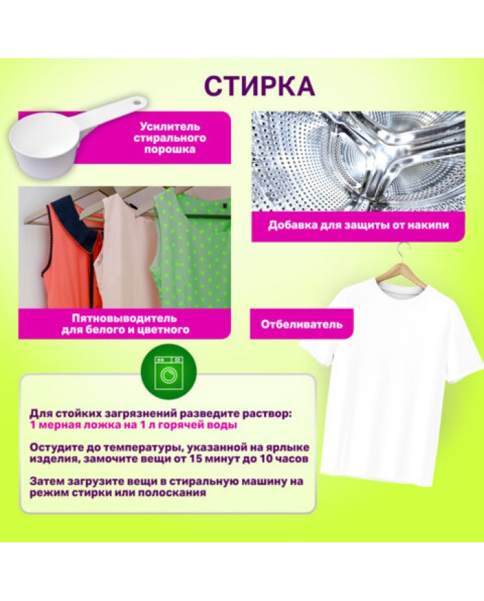 Не содержит отдушек, хлора, бора и других опасных компонентов. На основе активного кислорода. Подходит для белых и цветных вещей. Нейтрализует неприят..