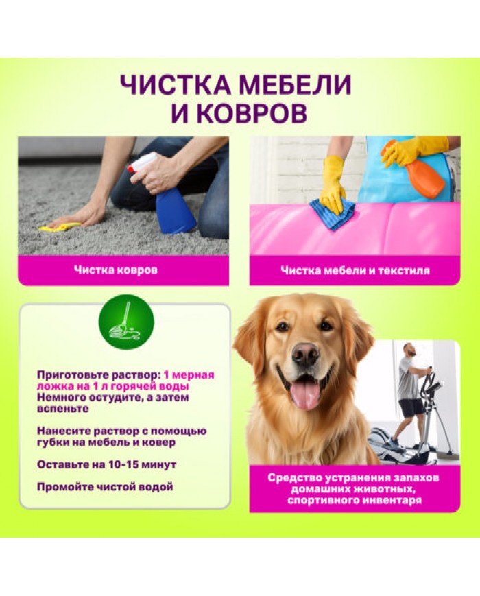 Преимущества: - эффективно устраняет загрязнения и отбеливает поверхность; - дезинфицирует; - устраняет неприятные запахи; - экономичный расход; - не ..