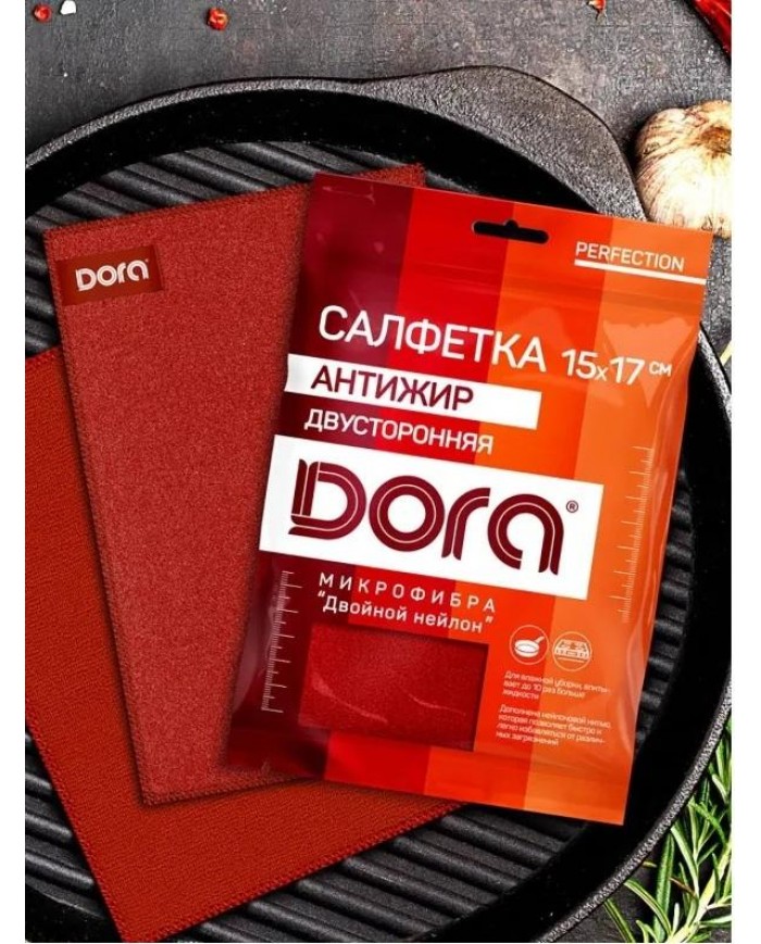 Салфетка антижир Dora 17x15 см. Назначение: удаление жира с посуды и кухонных поверхностей без применения бытовой химии. Уникальная, гигиеничная альтернатива кухонной губке, так как полностью высыхает и бактерии в ней не заводятся, по сроку службы без потери качества и внешних характеристик превышает срок службы поролоновой губки на несколько порядков. Особенности и преимущества: - эксклюзивная двухсторонняя текстура Super Double Nylon одна сторона легко удаляет стойкие жировые пятна, вторая сторона обладает повышенными впитывающими свойствами вытирает насухо, - повышенная износостойкость, - гигиеничная альтернатива кухонной губке, - не линяет, не выцветает. Характеристики: - размер 30x30 сантиметров, - цвет: красный, - плотность 300 грамм на квадратный метр, - состав: полиамид 20% полиэстер 80%, нейлон - 1 штука в упаковке. Рекомендации по уходу: машинная стирка при температуре 40С, без применения отбеливателей, кондиционеров и агрессивных моющих средств. Не сушить на батарее, не гладить утюгом.
