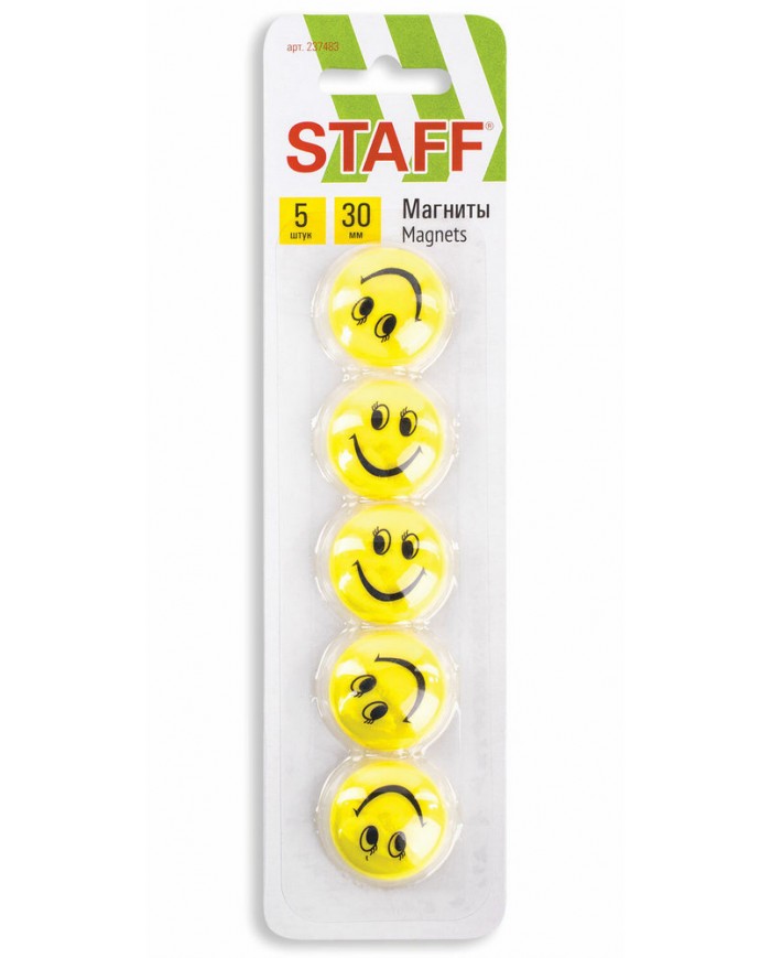 Магниты СРЕДНЕГО ДИАМЕТРА, 30 мм, НАБОР 5 штук, с рисунком СМАЙЛИК, жёлтые, в блистере, STAFF "Basic
