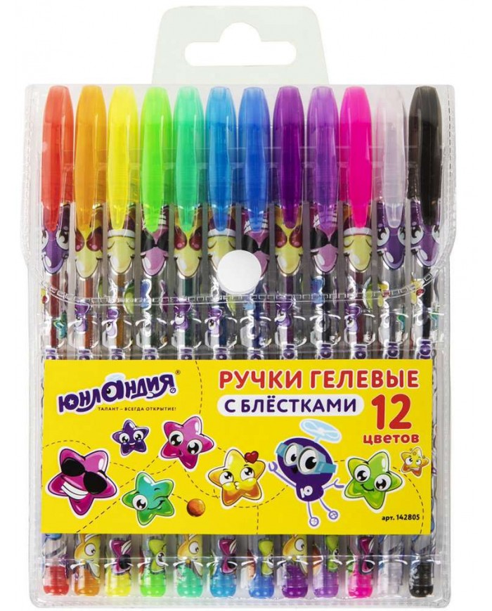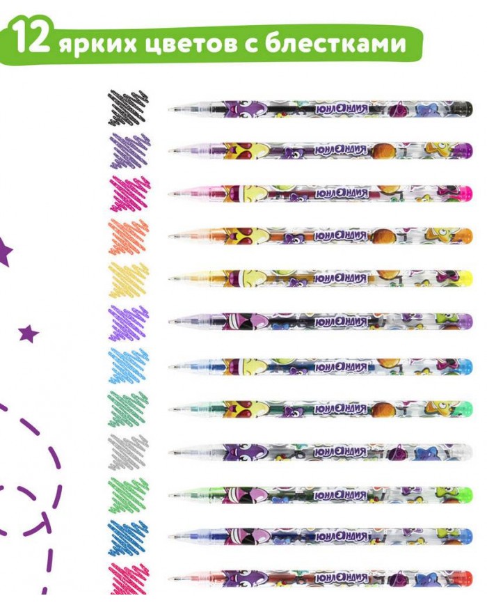 Ручки гелевые ЮНЛАНДИЯ, НАБОР 12 ЦВЕТОВ, БЛЕСТКИ, корпус с печатью, узел 0,7 мм, линия письма 0,5 мм