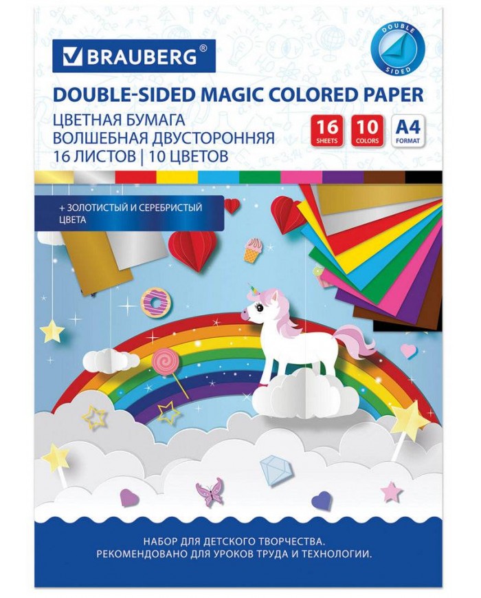 Цветная бумага А4 2-сторонняя офсетная ВОЛШЕБНАЯ, 16 листов 10 цветов, на скобе, BRAUBERG, 200х275 м