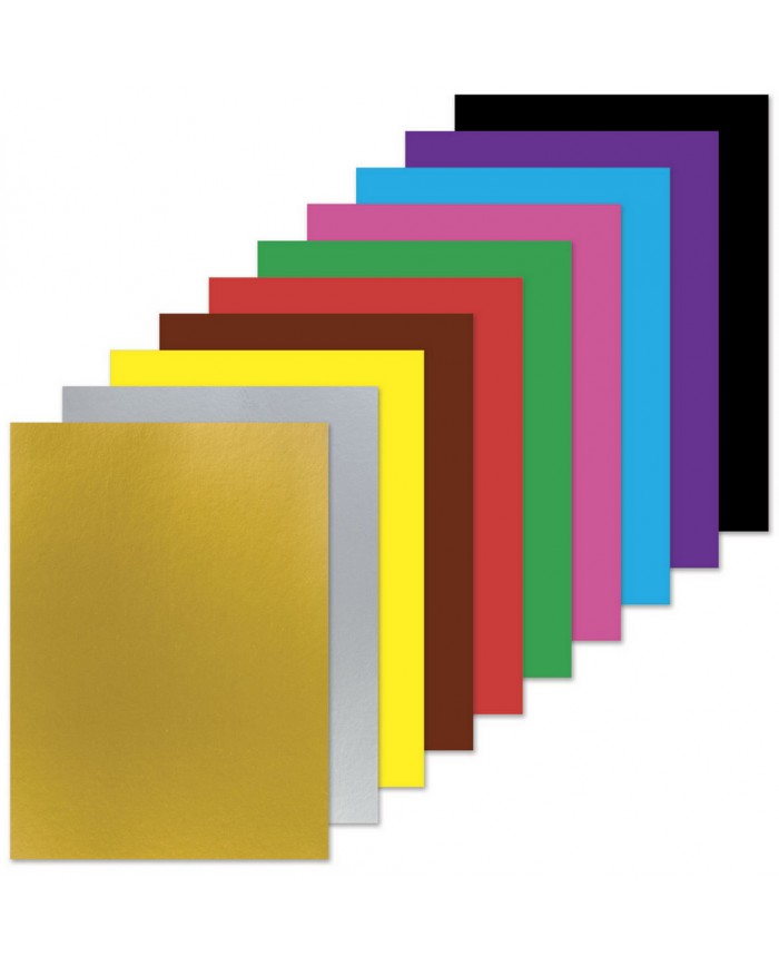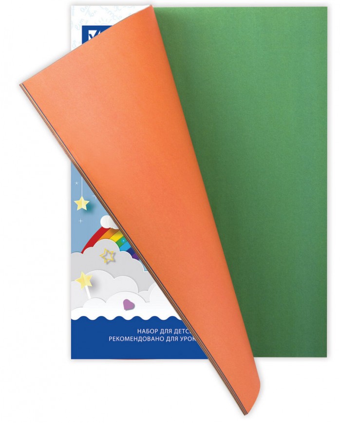 Набор офсетной двусторонней цветной бумаги плотностью 65 г/м2 включает 16 листов формата А4 (200х275 мм) в 8-ми разнообразных и насыщенных однородных цветах из офсетной бумаги (2 листа на один цвет) + 2 цвета мелованной бумаги плотностью 80 г/м золотого и серебряного цвета. Листы скреплены скобами, легко режутся и сгибаются.