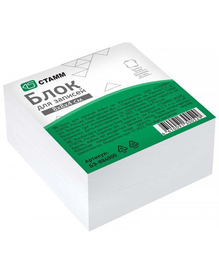 Блок для записей СТАММ 8*8*4см, белый, белизна 65-70%