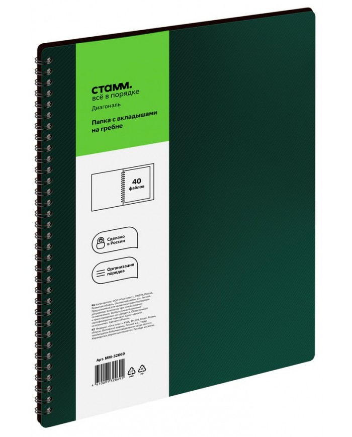 Папка с 40 вкладышами «СТАММ» серии «Диагональ» – отличный помощник для хранения бумаг формата А4. Внешняя сторона папки дополнена фактурным тиснением «Диагональ», сохраняющим внешний вид изделия от загрязнений и повреждений. Размер изделия составляет 310*235 мм. Ширина корешка – 21 мм. Тип скрепления – термосварка. Бумагам, вложенным в папку, не требуется перфорация дыроколом. На корешке папки есть удобный карман. Папка упакована в индивидуальный пакет.