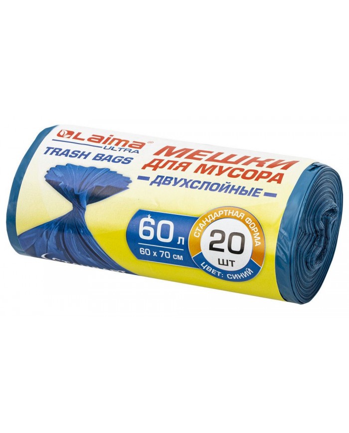 Мешки для мусора LAIMA "ULTRA" 60 л синие, в рулоне 20 шт. прочные, ПВД 21 мкм, 60х70 см,