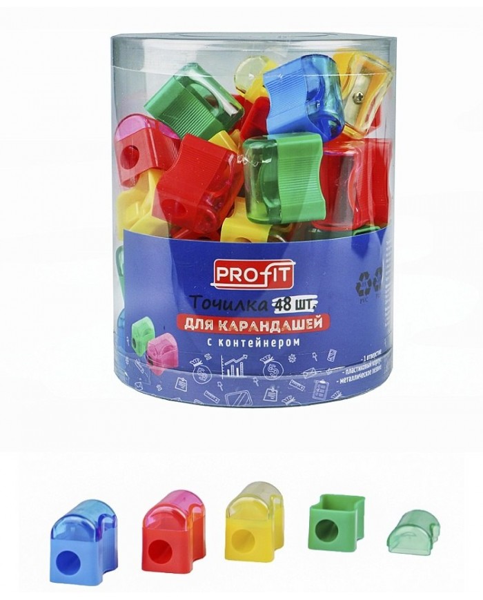 Точилка для карандашей 1 отв пластмассовая с контейнером, в пластик.тубе, ассорти