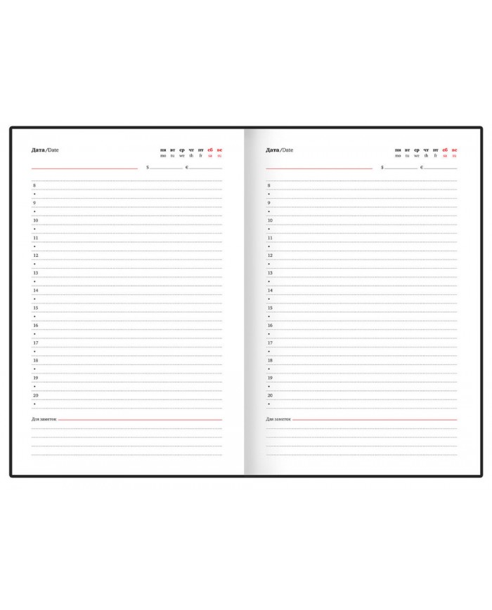 Внутренний блок состоит из 128 листов офсетной бумаги плотностью 60 г/м2. Обложка 7БЦ (твердый переплет с матовой пленкой) обеспечивает долговечность использования. Ежедневник снабжен резинкой-фиксатором, которая предотвращает его случайное открытие в сумке или портфеле. Отличительная особенность – наличие полей для проставления дат. Они не пропечатаны, что позволяет владельцу выделять под каждый день необходимое количество листов и записывать важные сведения. В конце ежедневника предусмотрены 4 страницы для дополнительных записей и заметок.