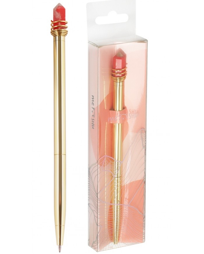 Шариковая ручка MESHU – это привлекательный аксессуар для ярких, смелых и успешных. Золотой корпус ручки из металла украшен перламутровым розовым кристаллом.