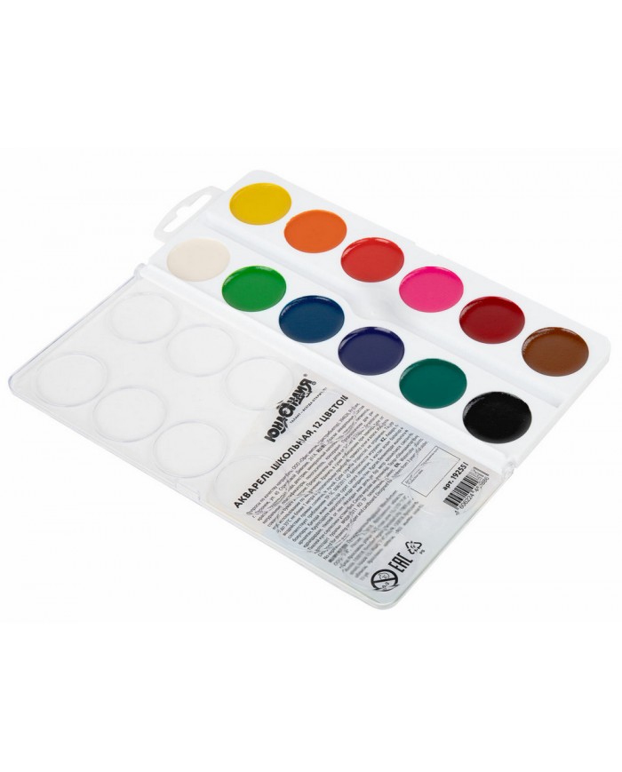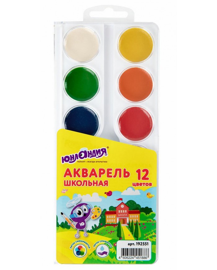 Краски акварельные ЮНЛАНДИЯ "ШКОЛЬНЫЕ" 12 цветов, медовые, круглые кюветы,