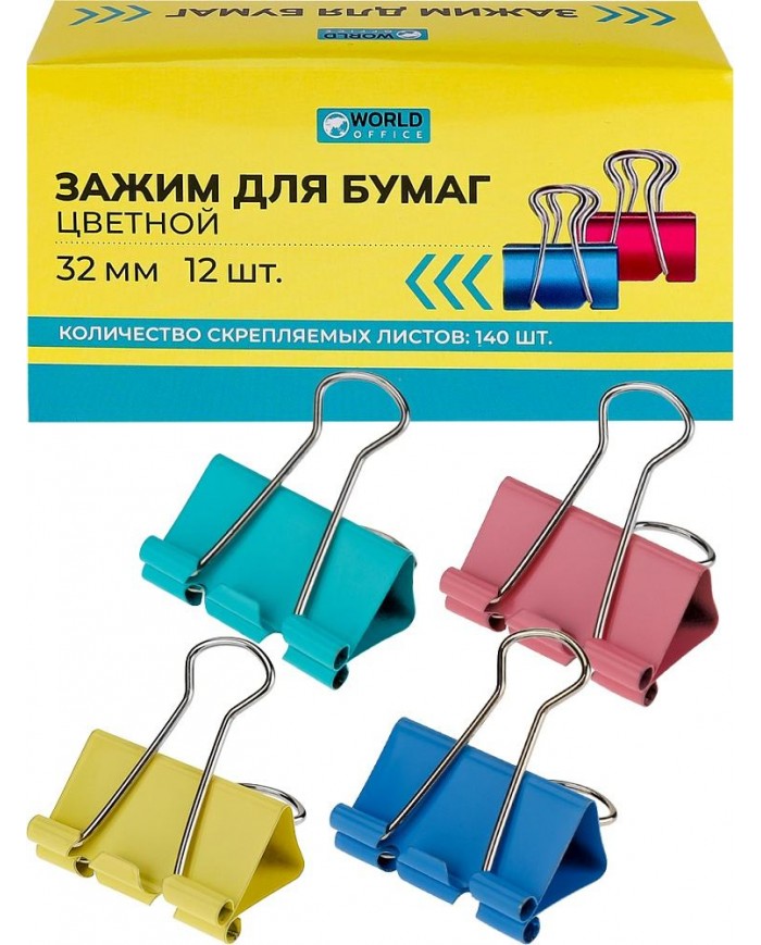 Зажим для бумаг ЦВЕТНОЙ, 32мм, (набор 12шт) в карт. Коробке