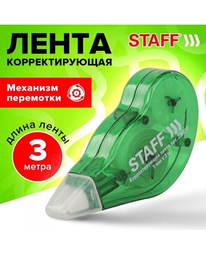 Корректирующая лента с подкручиванием STAFF EVERYDAY, 5 мм х 3 м, корпус зеленый, механизм перемотки