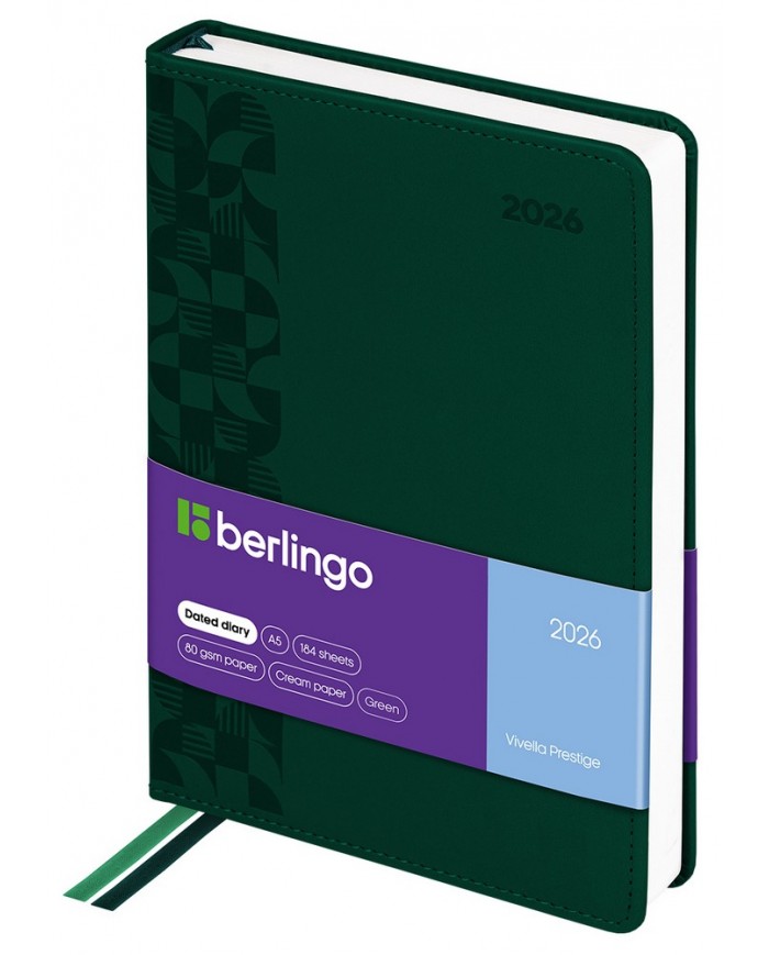 Датированный ежедневник на 2026 год Berlingo "Vivella Prestige" формата А5 идеален для повседневного использования. Размер — 150*215 мм. Модель представлена с твёрдой матовой обложкой из зелёной высококачественной экокожи. Имиджевое тиснение на обложке добавляет интересную деталь в классический дизайн.