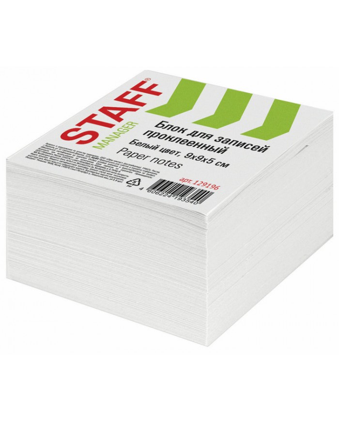 Блок высотой 5 см сложен из квадратных листов размером 9х9 см. Листы изготовлены из высококачественной офсетной бумаги плотностью 60 г/м2 и белизной 90-92%. Блок для записей подходит для письма любыми типами ручек и карандашей. Поставляется в плотной термоусадочной пленке, защищающей при транспортировке. Может использоваться как в пластиковых подставках для настольных органайзерах, так и без подставок, поскольку листы проклеены по одной стороне, что делает блок устойчивым и листы не рассыпаются.