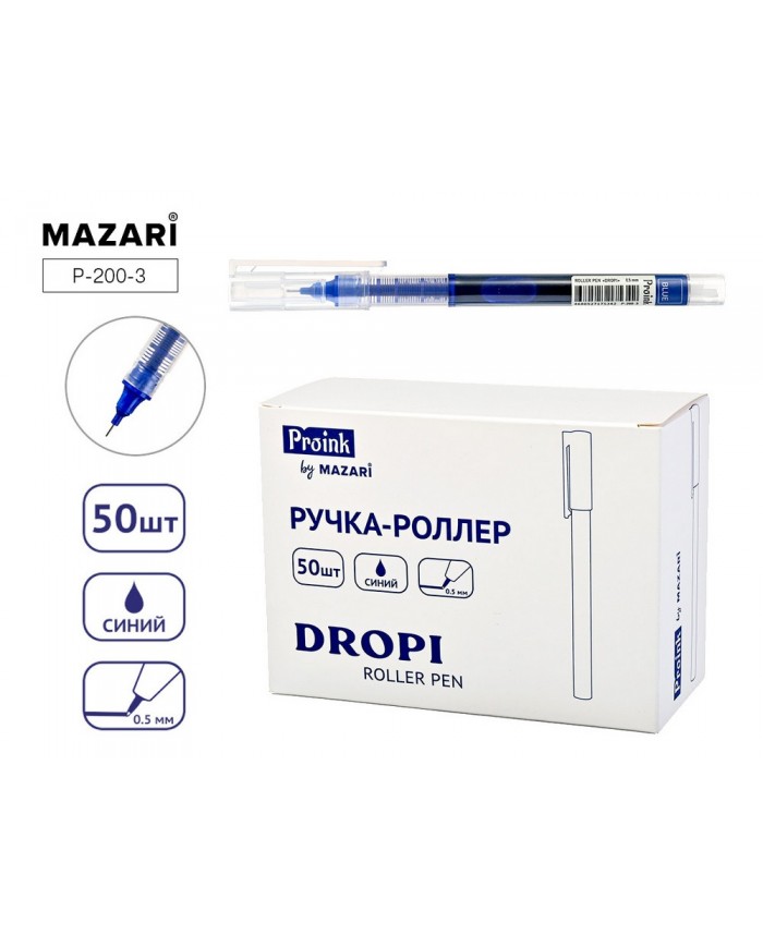 Ручка-роллер DROPI, СИНЯЯ, игольчатый пиш.узел 0.5мм, корпус пластиковый прозрачный,